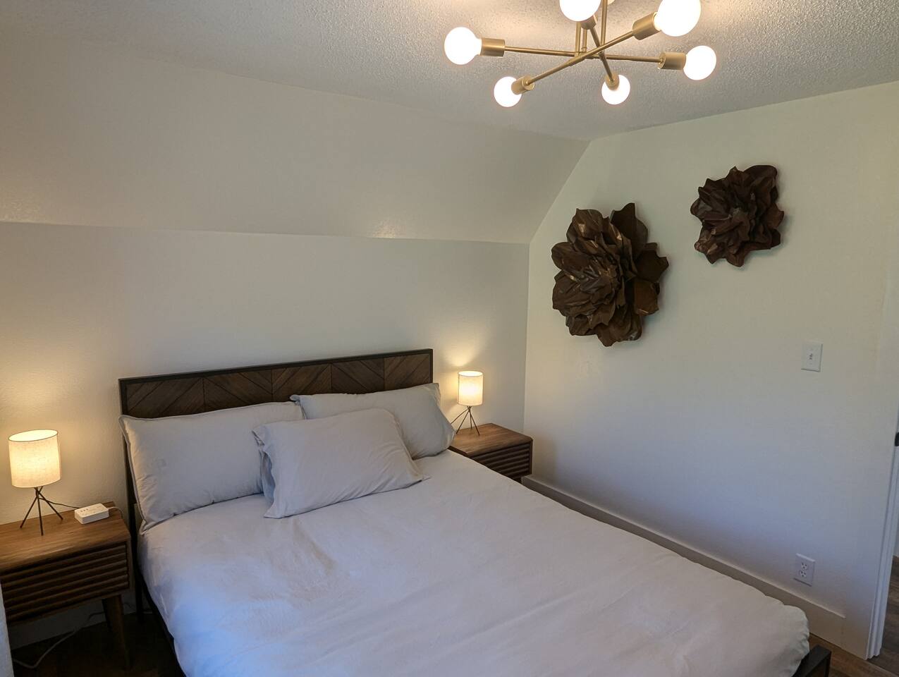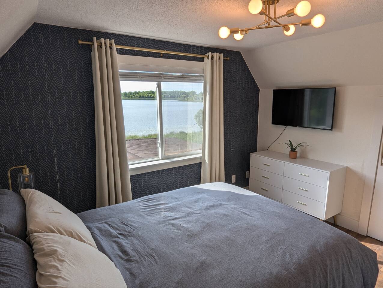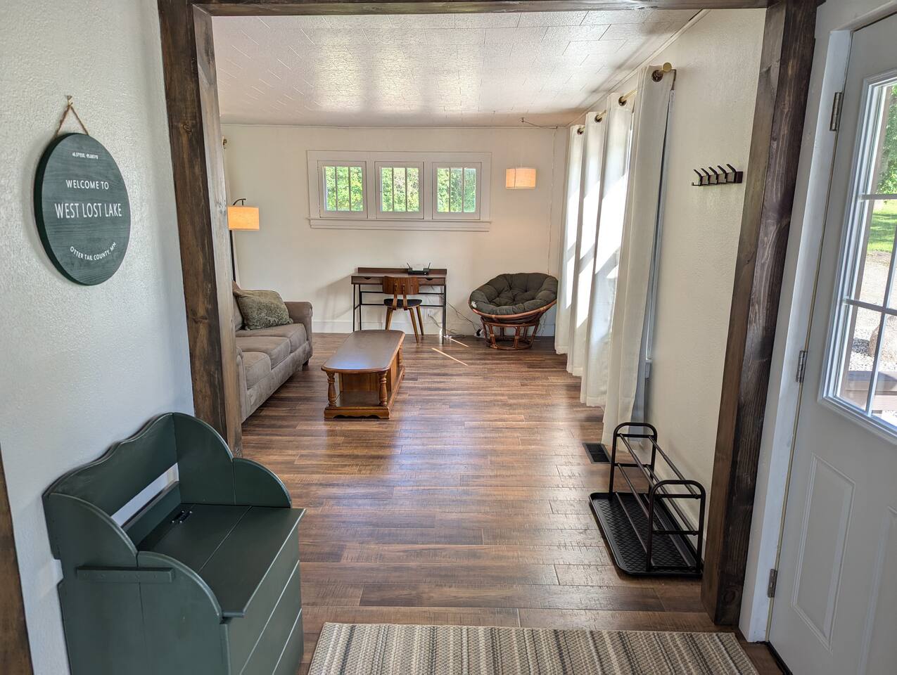 The Evergreen at West Lost Lake is part of Twin Pine Resort and was formerly the caretaker's house. The living area is an open kitchen, dining, two sitting rooms, and a large outdoor deck. This space features a view of West Lost Lake, a wood fireplace, long sectional, coffee bar, and 65" Smart TV. The kitchen is stocked with all common cooking utensils and kitchenware, including pots and pans, toaster, tea kettle, and coffee pot. The large deck has a propane grill, outdoor table with seating for 8, lounge furniture, propane fire table, and string lights over the entire deck. There are 3 bedrooms upstairs, each with a queen sized mattress and included bedding. There is an additional pull-out couch on the main floor and a Pack-n-Play available. There are two bathrooms stocked with linens, shampoo, soap, and toilet paper. The main floor bathroom is a full bathroom with a walk-in shower. The other upstairs bathroom is also a full bathroom which has a tub only. There is a utility room next to the main floor bathroom with a washer and dryer. The fire pit is located just off the deck with a great view of the lake. The property is large, partially wooded, and right on the lake so there is plenty of wildlife including birds, deer, waterfowl, turtles, and bugs.